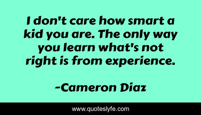 This page presents the quote "I don't care how smart a kid you are. The only way you learn what's not right is from experience.". Author of this quote is Cameron Diaz. This quote is about smart, care,.