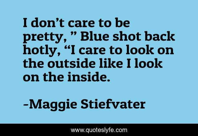 This page presents the quote "I don’t care to be pretty, ” Blue shot back hotly, “I care to look on the outside like I look on the inside.". Author of this quote is Maggie Stiefvater. This quote is about blue, beauty,.