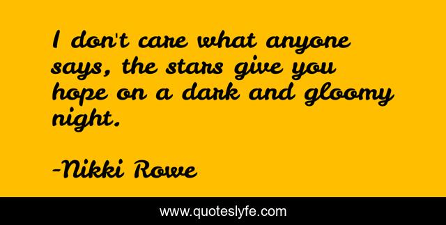 This page presents the quote "I don't care what anyone says, the stars give you hope on a dark and gloomy night.". Author of this quote is Nikki Rowe. This quote is about spiritual, shooting-static-magic, connection, euphoria, meaning, courage, purpose, stars, soul,.