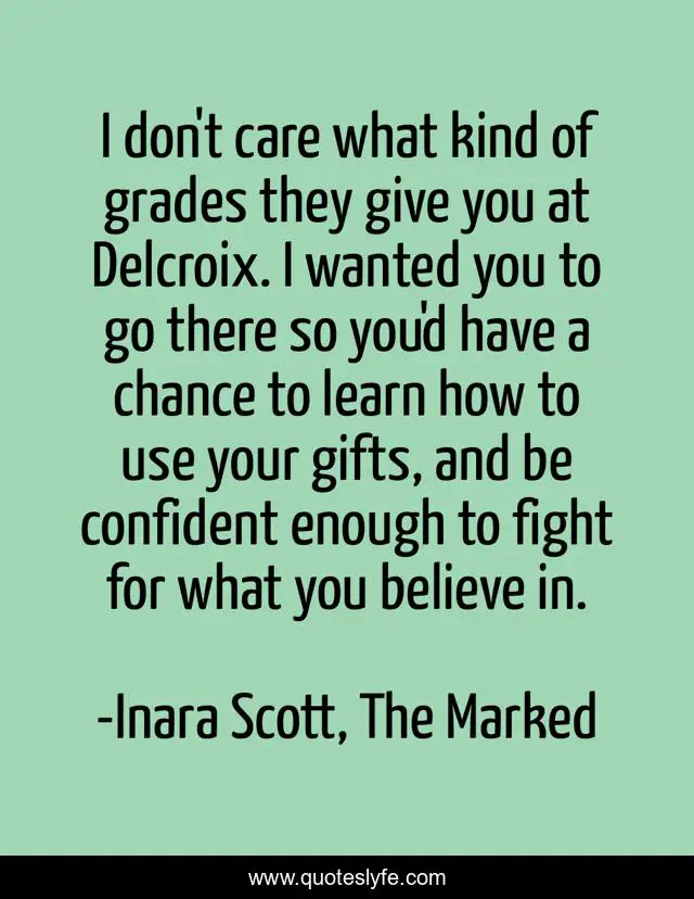This page presents the quote "I don't care what kind of grades they give you at Delcroix. I wanted you to go there so you'd have a chance to learn how to use your gifts, and be confident enough to fight for what you believe in.". Author of this quote is Inara Scott, The Marked. .