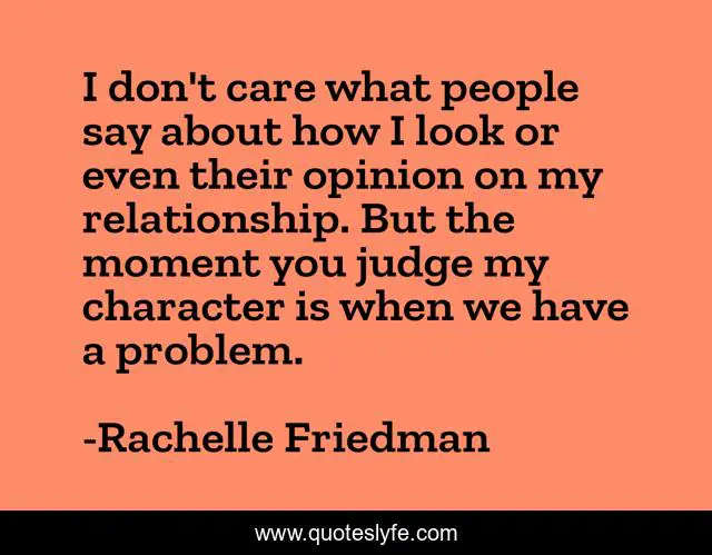 This page presents the quote "I don't care what people say about how I look or even their opinion on my relationship. But the moment you judge my character is when we have a problem.". Author of this quote is Rachelle Friedman. This quote is about awesome, courage, character, bully,.