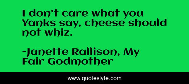 This page presents the quote "I don't care what you Yanks say, cheese should not whiz.". Author of this quote is Janette Rallison, My Fair Godmother. This quote is about food, americans, cheese-whiz, humor, leprechaun,.