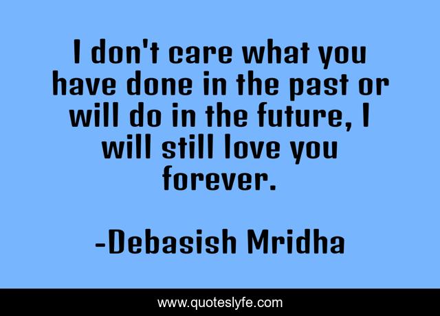This page presents the quote "I don't care what you have done in the past or will do in the future, I will still love you forever.". Author of this quote is Debasish Mridha. This quote is about life, love, knowledge, inspirational, intelligence, philosophy, wisdom, quotes, affection,.
