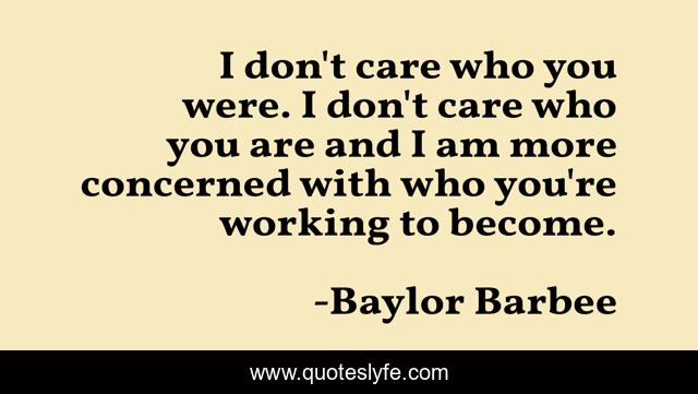 This page presents the quote "I don't care who you were. I don't care who you are and I am more concerned with who you're working to become.". Author of this quote is Baylor Barbee. This quote is about enthusiasm, change, inspirational,.