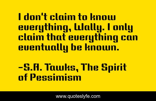 This page presents the quote "I don't claim to know everything, Wally. I only claim that everything can eventually be known.". Author of this quote is S.A. Tawks, The Spirit of Pessimism. This quote is about spirituality, author, writing, imagination, reader, reading,.