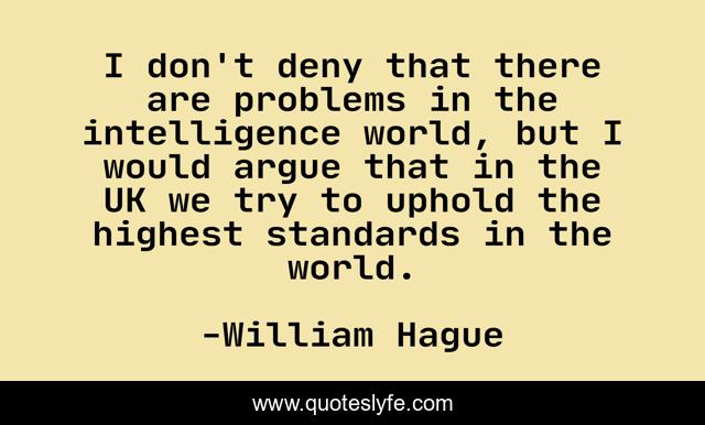 This page presents the quote "I don't deny that there are problems in the intelligence world, but I would argue that in the UK we try to uphold the highest standards in the world.". Author of this quote is William Hague. This quote is about try, world, problems,.