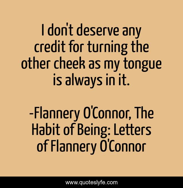 This page presents the quote "I don't deserve any credit for turning the other cheek as my tongue is always in it.". Author of this quote is Flannery O'Connor, The Habit of Being: Letters of Flannery O'Connor. This quote is about wit, humor,.