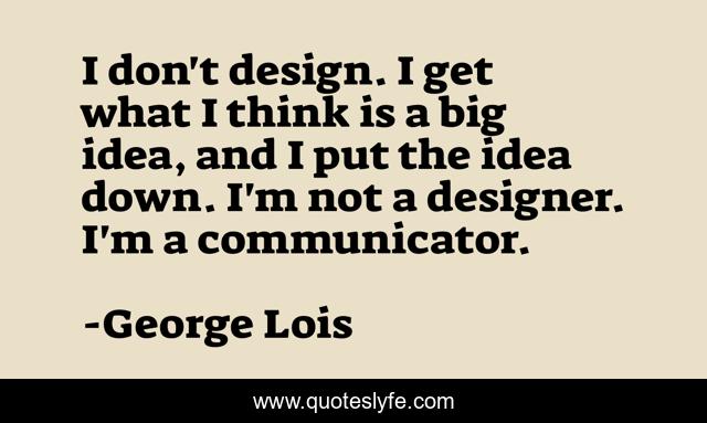 This page presents the quote "I don't design. I get what I think is a big idea, and I put the idea down. I'm not a designer. I'm a communicator.". Author of this quote is George Lois. This quote is about down, think, idea,.