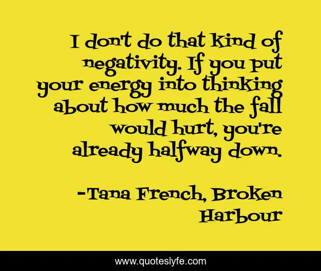 This page presents the quote "I don't do that kind of negativity. If you put your energy into thinking about how much the fall would hurt, you're already halfway down.". Author of this quote is Tana French, Broken Harbour. This quote is about failure, positive-mindset, broken-harbor, success,.