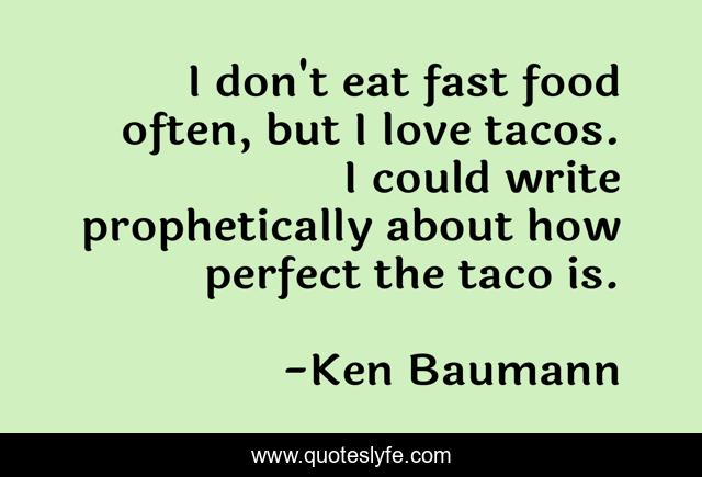 This page presents the quote "I don't eat fast food often, but I love tacos. I could write prophetically about how perfect the taco is.". Author of this quote is Ken Baumann. This quote is about perfect, love, affection, taco,.