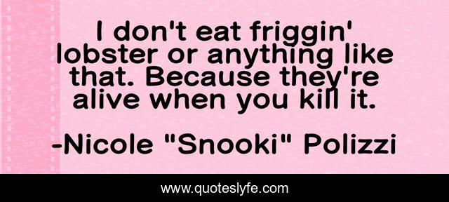 This page presents the quote "I don't eat friggin' lobster or anything like that. Because they're alive when you kill it.". Author of this quote is Nicole "Snooki" Polizzi. This quote is about food, idiots, death, lobster,.