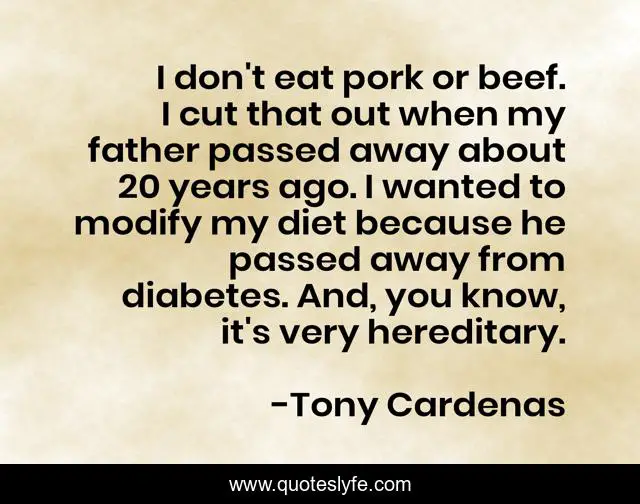 This page presents the quote "I don't eat pork or beef. I cut that out when my father passed away about 20 years ago. I wanted to modify my diet because he passed away from diabetes. And, you know, it's very hereditary.". Author of this quote is Tony Cardenas. This quote is about father, diabetes,.