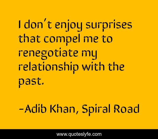 This page presents the quote "I don’t enjoy surprises that compel me to renegotiate my relationship with the past.". Author of this quote is Adib Khan, Spiral Road. This quote is about past, resistance-is-futile,.
