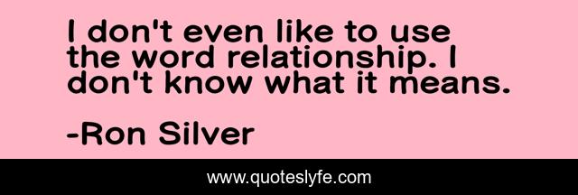 This page presents the quote "I don't even like to use the word relationship. I don't know what it means.". Author of this quote is Ron Silver. This quote is about word, like,.