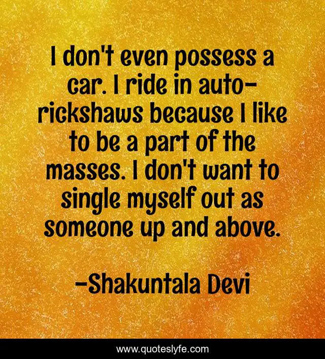 This page presents the quote "I don't even possess a car. I ride in auto-rickshaws because I like to be a part of the masses. I don't want to single myself out as someone up and above.". Author of this quote is Shakuntala Devi. This quote is about myself, ride,.