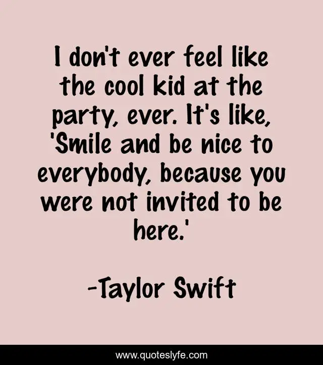 This page presents the quote "I don't ever feel like the cool kid at the party, ever. It's like, 'Smile and be nice to everybody, because you were not invited to be here.'". Author of this quote is Taylor Swift. This quote is about smile, party, happiness, nice,.