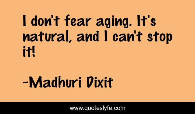 This page presents the quote "I don't fear aging. It's natural, and I can't stop it!". Author of this quote is Madhuri Dixit. This quote is about aging, stop, natural,.