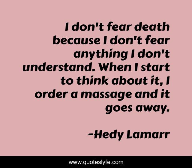 This page presents the quote "I don't fear death because I don't fear anything I don't understand. When I start to think about it, I order a massage and it goes away.". Author of this quote is Hedy Lamarr. This quote is about start, fear, think,.