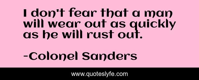 This page presents the quote "I don't fear that a man will wear out as quickly as he will rust out.". Author of this quote is Colonel Sanders. This quote is about rust, man,.