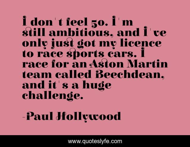 This page presents the quote "I don't feel 50. I'm still ambitious, and I've only just got my licence to race sports cars. I race for an Aston Martin team called Beechdean, and it's a huge challenge.". Author of this quote is Paul Hollywood. This quote is about challenge, race, team,.