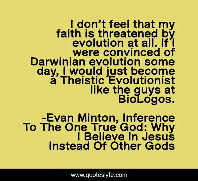 This page presents the quote "I don’t feel that my faith is threatened by evolution at all. If I were convinced of Darwinian evolution some day, I would just become a Theistic Evolutionist like the guys at BioLogos.". Author of this quote is Evan Minton, Inference To The One True God: Why I Believe In Jesus Instead Of Other Gods. This quote is about faith, evolution, god,.