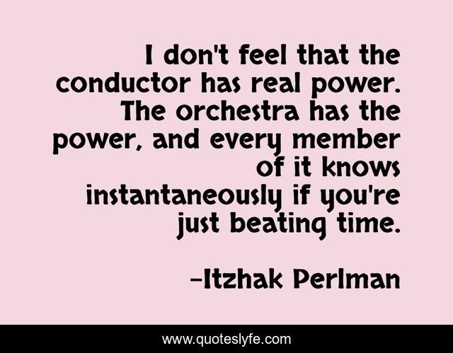 This page presents the quote "I don't feel that the conductor has real power. The orchestra has the power, and every member of it knows instantaneously if you're just beating time.". Author of this quote is Itzhak Perlman. This quote is about orchestra, time,.