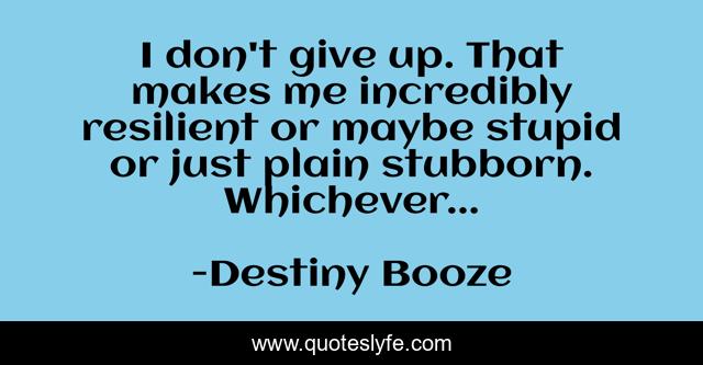 This page presents the quote "I don't give up. That makes me incredibly resilient or maybe stupid or just plain stubborn. Whichever...". Author of this quote is Destiny Booze. This quote is about confidence, positive, motivational, determination, optimistic, resilient,.