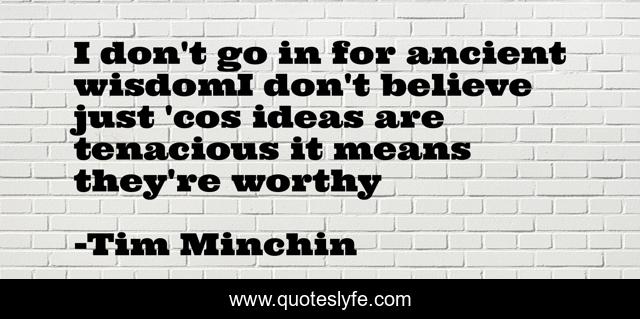 This page presents the quote "I don't go in for ancient wisdomI don't believe just 'cos ideas are tenacious it means they're worthy". Author of this quote is Tim Minchin. This quote is about religion, wisdom, ideas, worthy,.
