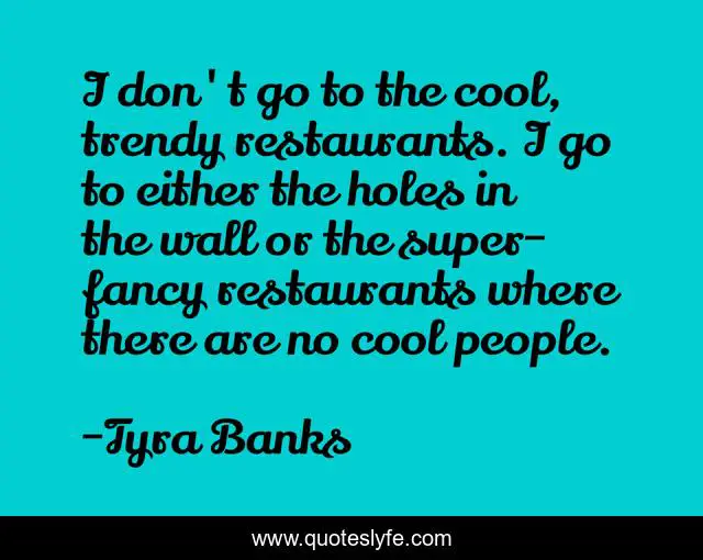 This page presents the quote "I don't go to the cool, trendy restaurants. I go to either the holes in the wall or the super-fancy restaurants where there are no cool people.". Author of this quote is Tyra Banks. This quote is about wall, people,.
