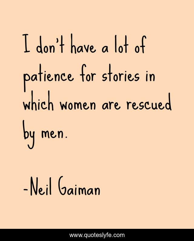 This page presents the quote "I don't have a lot of patience for stories in which women are rescued by men.". Author of this quote is Neil Gaiman. This quote is about self, valour, courage, fairy-tales, bravery, feminism, women,.