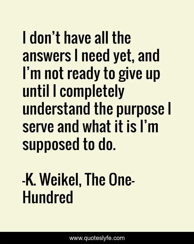 This page presents the quote "I don’t have all the answers I need yet, and I’m not ready to give up until I completely understand the purpose I serve and what it is I’m supposed to do.". Author of this quote is K. Weikel, The One-Hundred. This quote is about strength, weikel, answers,.