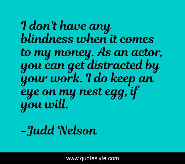 This page presents the quote "I don't have any blindness when it comes to my money. As an actor, you can get distracted by your work. I do keep an eye on my nest egg, if you will.". Author of this quote is Judd Nelson. This quote is about work, eye,.