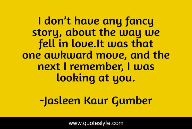 This page presents the quote "I don’t have any fancy story, about the way we fell in love.It was that one awkward move, and the next I remember, I was looking at you.". Author of this quote is Jasleen Kaur Gumber. This quote is about true-love, heart, love, romantic, simple, joy, confession, love-at-first-sight, first-love,.