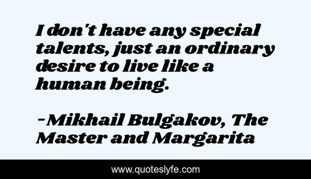 This page presents the quote "I don't have any special talents, just an ordinary desire to live like a human being.". Author of this quote is Mikhail Bulgakov, The Master and Margarita. This quote is about life, humor,.