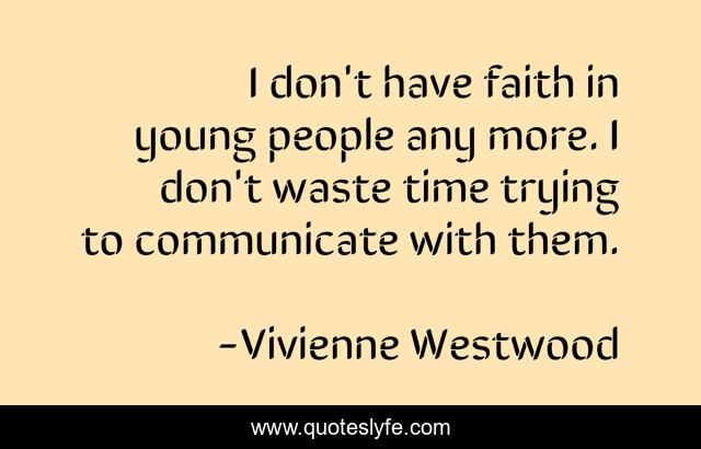 This page presents the quote "I don't have faith in young people any more. I don't waste time trying to communicate with them.". Author of this quote is Vivienne Westwood. This quote is about trying, time, people,.