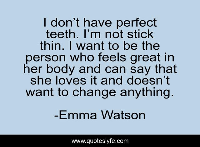 This page presents the quote "I don’t have perfect teeth. I’m not stick thin. I want to be the person who feels great in her body and can say that she loves it and doesn’t want to change anything.". Author of this quote is Emma Watson. This quote is about body, confidence, motivational, self-confidence, positive, insecurities, optimistic, inspirational, enthusiasm,.