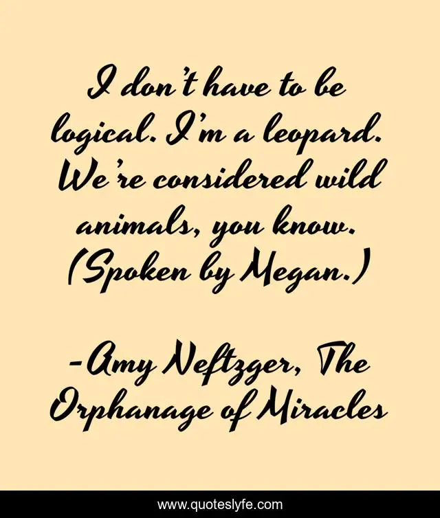 This page presents the quote "I don’t have to be logical. I’m a leopard. We’re considered wild animals, you know. (Spoken by Megan.)". Author of this quote is Amy Neftzger, The Orphanage of Miracles. This quote is about animals, leopard, wild-animal, logic,.