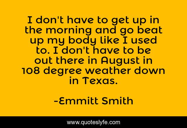 This page presents the quote "I don't have to get up in the morning and go beat up my body like I used to. I don't have to be out there in August in 108 degree weather down in Texas.". Author of this quote is Emmitt Smith. This quote is about body, down, weather,.