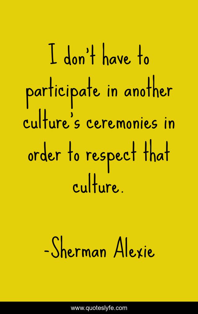 This page presents the quote "I don't have to participate in another culture's ceremonies in order to respect that culture.". Author of this quote is Sherman Alexie. This quote is about culture, order, ceremonies,.