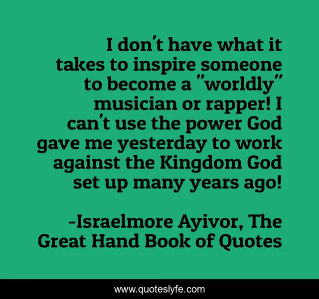 This page presents the quote "I don't have what it takes to inspire someone to become a "worldly" musician or rapper! I can't use the power God gave me yesterday to work against the Kingdom God set up many years ago!". Author of this quote is Israelmore Ayivor, The Great Hand Book of Quotes. This quote is about jesus-christ, inspire, power-of-god, sinful, worldly-music, jesus, worldly, food-for-thought, christ,.
