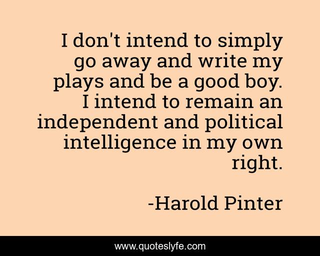 This page presents the quote "I don't intend to simply go away and write my plays and be a good boy. I intend to remain an independent and political intelligence in my own right.". Author of this quote is Harold Pinter. This quote is about independent, good, political,.