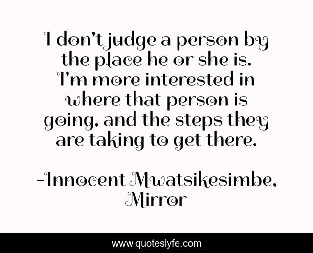 This page presents the quote "I don't judge a person by the place he or she is. I'm more interested in where that person is going, and the steps they are taking to get there.". Author of this quote is Innocent Mwatsikesimbe, Mirror. This quote is about life, people, positive, motivational, confidence, judgement, optimistic, inspirational, opinion,.