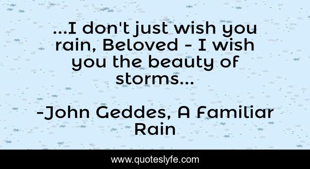 This page presents the quote "...I don't just wish you rain, Beloved - I wish you the beauty of storms...". Author of this quote is John Geddes, A Familiar Rain. This quote is about storms, beauty, rain, transformation,.