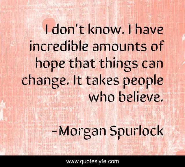 This page presents the quote "I don't know. I have incredible amounts of hope that things can change. It takes people who believe.". Author of this quote is Morgan Spurlock. This quote is about believe, change, people,.