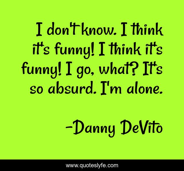 This page presents the quote "I don't know. I think it's funny! I think it's funny! I go, what? It's so absurd. I'm alone.". Author of this quote is Danny DeVito. This quote is about alone, think,.
