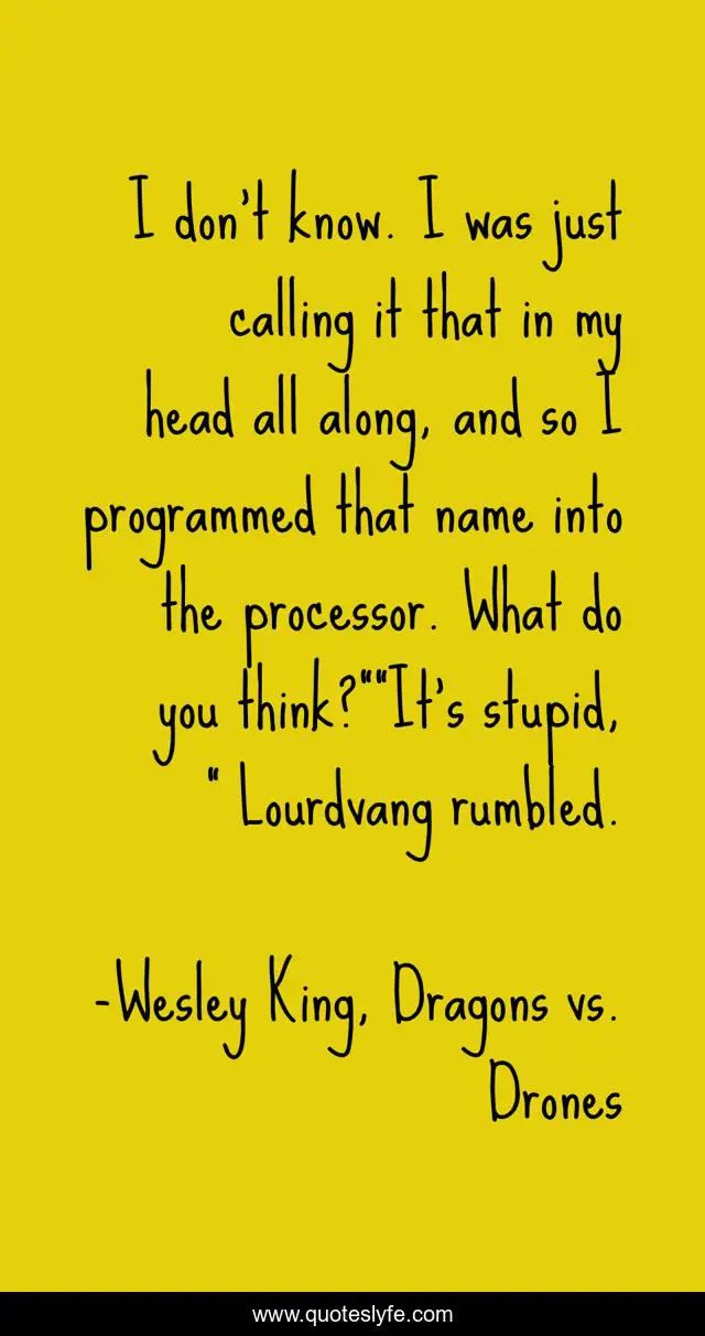 This page presents the quote "I don't know. I was just calling it that in my head all along, and so I programmed that name into the processor. What do you think?""It's stupid, " Lourdvang rumbled.". Author of this quote is Wesley King, Dragons vs. Drones. This quote is about baby-hybrid, lourdvang, dragons,.