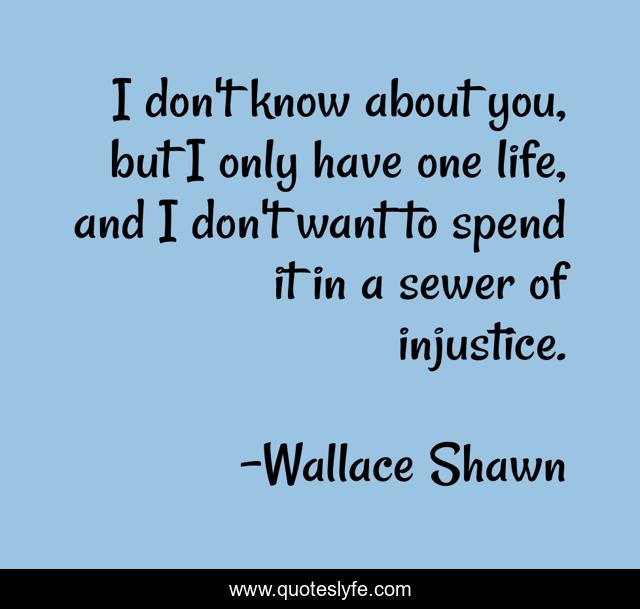 This page presents the quote "I don't know about you, but I only have one life, and I don't want to spend it in a sewer of injustice.". Author of this quote is Wallace Shawn. This quote is about life, laura-flanders, protest, inequality, injustice, occupy-wall-street,.