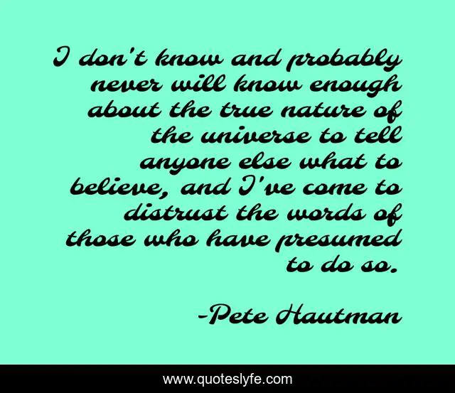 This page presents the quote "I don't know and probably never will know enough about the true nature of the universe to tell anyone else what to believe, and I've come to distrust the words of those who have presumed to do so.". Author of this quote is Pete Hautman. .