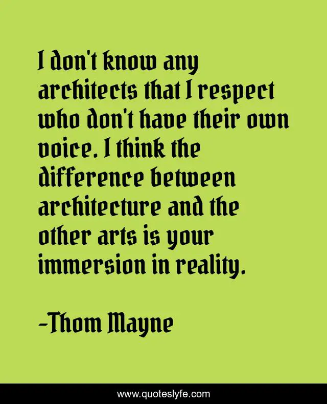 This page presents the quote "I don't know any architects that I respect who don't have their own voice. I think the difference between architecture and the other arts is your immersion in reality.". Author of this quote is Thom Mayne. This quote is about respect, reality,.