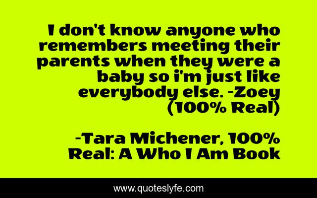 This page presents the quote "I don't know anyone who remembers meeting their parents when they were a baby so i'm just like everybody else. -Zoey (100% Real)". Author of this quote is Tara Michener, 100% Real: A Who I Am Book. This quote is about bullying, children-s-books, self-esteem, childrens-literature, adoption,.